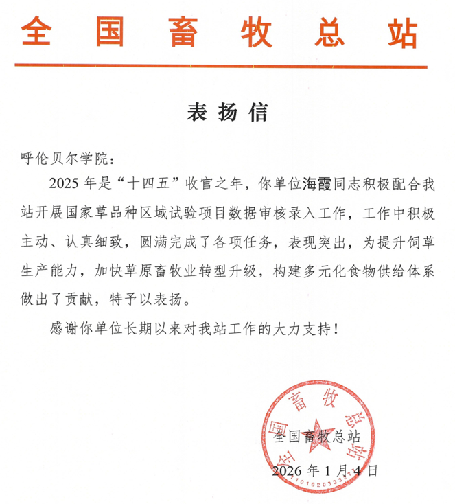 近日,全国畜牧总站向我校发来表扬信,农学院海霞老师在国家草品种区域试验项目数据审核录入工作中积极主动、认真细致,以高度的责任心对待各项工作,圆满完成各项任务。这份殊荣,既是对海霞老师的专业素养、责任意识与奉献精神的集中褒奖,更是国家主管部门对我校专业科研能力、高效执行水平的高度肯定。